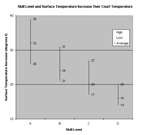 The vertical axis shows how much the surface temperature increased over the ambient temperature of the court. The horizontal axis shows the skill levels.