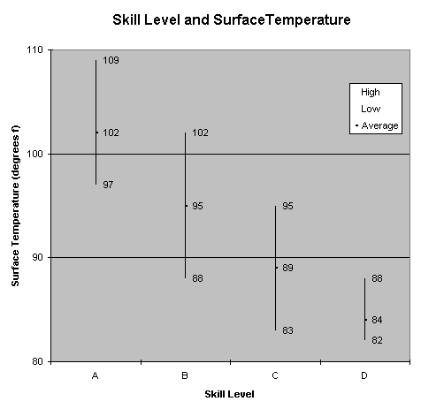 The following chart shows the average surface temperature for each skill level. The high and low surface temperature readings for each skill level are also shown.
